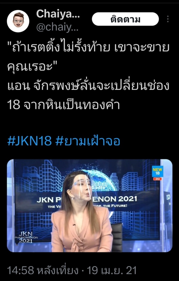 4. แม้จะปฏิเสธเรื่องขายช่อง JKN18 เพราะจะกลายเป็นว่าบริษัทไม่ปฏิบัติตามข้อบังคับ กสทช. แล้วยังส่งผลถึงราคาหุ้นด้วยนั้น แต่ไม่ปฏิเสธเรื่องเงิน 500 ล้านบาท ในการดีลกับ Topnews ครั้งนี้ และอาจมองว่าหลังการประกวดเวที Miss Universe หากสถานการณ์บัญชีและหุ้นกู้ของ JKN ยังไม่กลับสู่ภาวะสร้างกำไร โอกาสที่เราจะได้เห็นช่อง Topnews18 เกิดขึ้นจริงตามข่าวลือก็มีไม่น้อย