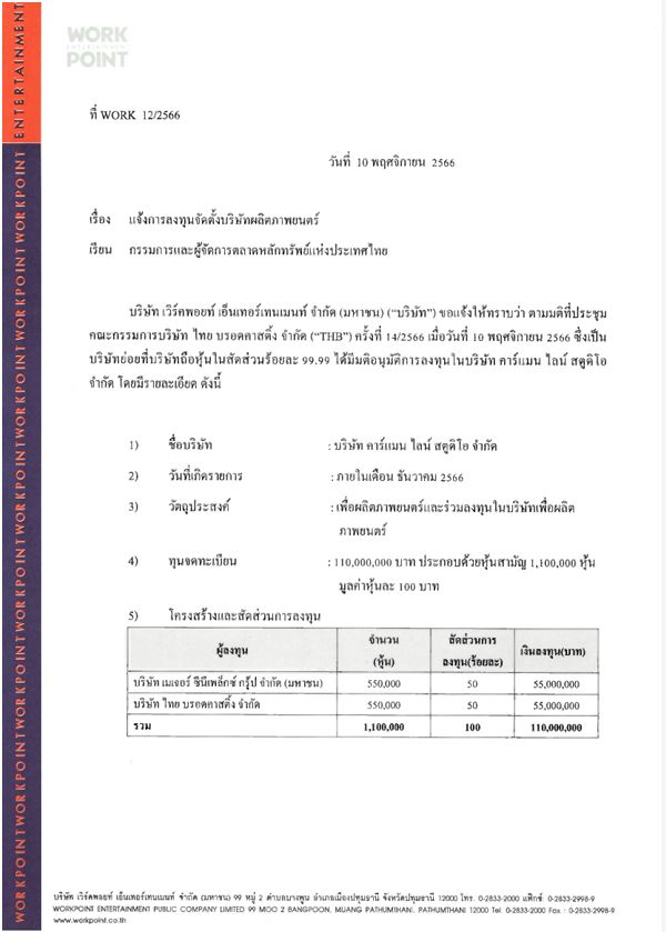นายสุรการ ศิริโมทย์ ประธานเจ้าหน้าที่บริหารฝ่ายการเงิน บมจ.เวิร์คพอยท์ เอ็นเทอร์เทนเมนท์ หรือ WORK แจ้งต่อตลาดหลักทรัพย์แห่งประเทศไทยว่า ที่ประชุมคณะกรรมการ บริษัท ไทย บรอดคาสติ้ง จำกัด (THB) ซึ่งเป็นบริษัทย่อยที่บริษัทถือหุ้นในสัดส่วน 99.99% มีมติอนุมัติการลงทุนในบริษัท คาร์แมน ไลน์ สตูดิโอ จำกัด เพื่อผลิตภาพยนตร์และร่วมลงทุนในบริษัทเพื่อผลิตภาพยนตร์ โดยจะทำรายการภายในเดือนธันวาคม 2566