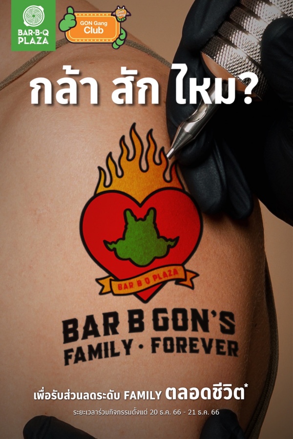 บาร์บีคิวพลาซ่าชวนคนคลั่งรัก GON มาสักเป็นครอบครัว GON Gang Club ตลอดไป ต่อยอดจากแคมเปญ Collaboration สุดปังส่งท้ายปีของบาร์บีคิวพลาซ่า พร้อมรับส่วนลดสุดจึ้ง 15% ตลอดชีพ รับจำนวนจำกัดเท่านั้น นอกเหนือจากส่วนลดแล้ว GON Gang Club ยังเพิ่มความเอ็กซ์คลูซีฟในครั้งนี้กับลายสัก 10 แบบ 10 สไตล์ ที่สามารถเลือกได้ตามใจชอบ พร้อมบัตรสมาชิก GON Gang Club ลายพิเศษระดับ Bar B GON’s Family Forever ที่ออกแบบพิเศษเพื่องานนี้โดยเฉพาะ โดยทำงานร่วมกับช่างสักมืออาชีพ จากร้าน Inkception Tattoo Studio ตั้งอยู่ในใจกลางสยามสแควร์ ชั้น 2 ของลิโด้ คอนเน็คท์ ที่มีประการณ์และความเชี่ยวชาญกว่า 10 ปี มาให้บริการสักในครั้งนี้ เตรียมรับสัมผัสประสบการณ์เอ็กซ์คลูซีฟและความสนุกแบบนี้ได้อีกกับ GON Gang Club สมัครเลย! Line @GONGang