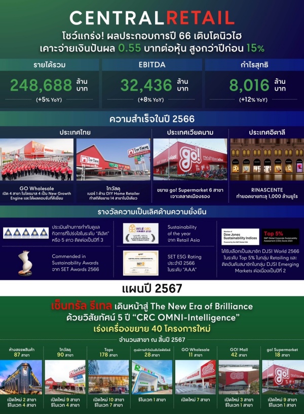 เซ็นทรัล รีเทล สร้างนิวไฮปี 66 อวดกำไรทะลุ 8,016 ลบ. โต 12%เคาะจ่ายเงินปันผล 0.55 บาทต่อหุ้น สูงกว่าปีก่อน 15%
