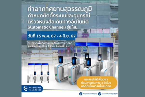 ท่าอากาศยานสุวรรณภูมิ (ทสภ.) กำหนดการติดตั้งระบบและอุปกรณ์ตรวจหนังสือเดินทางอัตโนมัติ (Automatic Channel) รุ่นใหม่เพื่อทดแทนรุ่นเดิม และรื้อถอนเคาน์เตอร์ตรวจหนังสือเดินทางแบบเดิมบางส่วนที่มีเจ้าหน้าที่ตำรวจตรวจคนเข้าเมืองปฏิบัติหน้าที่ตรวจหนังสือเดินทาง (Conventional Counter) เป็นแบบช่องตรวจอัตโนมัติ (Automatic Channel) ทั้งนี้ เพื่อเพิ่มประสิทธิภาพในการให้บริการตรวจหนังสือเดินทางของ ทสภ. ให้มีความคล่องตัวและรวดเร็วมากยิ่งขึ้น โดยในระยะแรกจะดำเนินการบริเวณพื้นที่ตรวจหนังสือเดินทางขาออกระหว่างประเทศโซน 2 ฝั่งตะวันตก ชั้น 4 อาคารผู้โดยสาร ทสภ. ซึ่งจะส่งผลให้ต้องมีการปิดการใช้งานพื้นที่บริเวณดังกล่าวบางส่วน ในช่วงระหว่างวันที่ 15 พฤษภาคม – 4 มิถุนายนนี้