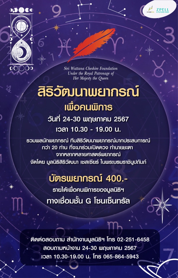 ศูนย์การค้าฟิวเจอร์พาร์ค ร่วมกับ มูลนิธิสิริวัฒนาเชสเชียร์ ในพระบรมราชินูปถัมภ์ จัดงานสิริวัฒนาพยากรณ์ เพื่อคนพิการ’ ครั้งที่ 2 ภายในงานพบกับการรวมตัวของสุดยอดนักโหราศาสตร์ชั้นนำของประเทศไทย กว่า 20 ท่าน ที่จะมาร่วมทำนายโชคชะตาราศีในศาสตร์ต่างๆ โดยงานจะจัดขึ้นระหว่าง วันที่ 24 – 30 พฤษภาคม 2567 ณ บริเวณทางเชื่อม ชั้น จี โซนเซ็นทรัล ศูนย์การค้าฟิวเจอร์พาร์ค ผู้สนใจเข้ารับการพยากรณ์ สามารถซื้อบัตรพยากรณ์ในราคาใบละ 400 บาท ที่บริเวณงาน โดยรายได้จากการจัดงานครั้งนี้ นำไปให้ผู้พิการของมูลนิธิสิริวัฒนาเชสเชียร์ ในพระบรมราชินูปถัมภ์ ต่อไป