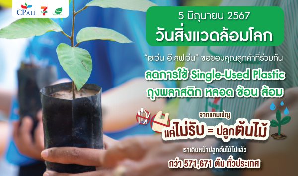 และปัญหาสิ่งแวดล้อมไม่ได้เป็นของใครคนใดคนหนึ่ง และไม่มีคำว่าสายเกินไปถ้าเราช่วยกันลงมือทำ บมจ.ซีพี ออลล์ ผู้บริหาร เซเว่น อีเลฟเว่น และ เซเว่น เดลิเวอรี่ จึงได้เดินหน้าเร่งปลูกต้นไม้จากแคมเปญ “แค่ไม่รับเท่ากับปลูกต้นไม้” ภายใต้โครงการ “ปลูกป่า ปลูกอนาคต” ร่วมกับพาคีเครือข่ายเพาะกล้าไม้ในโครงการฯ ทั้งชุมชน วัด โรงเรียน มหาวิทยาลัย เพื่อนำไปปลูกแล้วกว่า 571,671 ต้น ทั่วประเทศ เพื่อสร้างพื้นที่สีเขียวให้กับชุมชนพร้อมปลูกฝังจิตสำนึกรักษ์สิ่งแวดล้อมให้กับสังคมทั่วประเทศอย่างต่อเนื่อง สอดรับกับ “วันสิ่งแวดล้อมโลก” โดยมีเป้าหมายที่จะปลูกต้นไม้ให้ได้ทั้งสิ้น 1 ล้านต้น ภายในปี 2568
