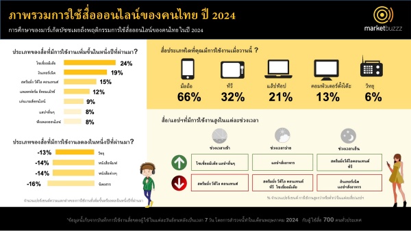 ผลจากการศึกษาพฤติกรรมการใช้สื่อของคนไทย จำนวน 700 คนทั่วประเทศ จัดทำโดย Marketbuzzz ได้แสดงให้เห็นการใช้สื่อต่างๆ ท่ามกลางสื่อที่มีความหลากหลายและสภาพแวดล้อมสื่อที่เปลี่ยนแปลงไป โดยผู้เข้าร่วมการสำรวจจะบันทึกข้อมูลการใช้สื่อตลอดหนึ่งสัปดาห์ ทำให้ได้ข้อมูลเชิงลึกถึงการใช้สื่อของคนไทยบนแพลตฟอร์มต่างๆ ในช่วงเวลาที่แตกต่างกันในแต่ละวัน และเปรียบเทียบการใช้สื่อในวันธรรมดาและวันหยุดสุดสัปดาห์
