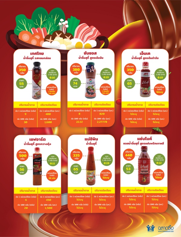 นิตยสารฉลาดซื้อได้สุ่มเลือกน้ำจิ้มสุกี้บรรจุขวด จำนวน 12 ตัวอย่าง เมื่อเดือนมิถุนายน 2567 มาสำรวจฉลากเปรียบเทียบดูน้ำตาล โซเดียมและราคา รวมทั้งดูว่ายี่ห้อไหนมีหรือไม่มีวัตถุปรุงแต่งรสอาหาร วัตถุกันเสียและสีด้วย เพื่อให้ผู้บริโภคใช้เป็นข้อมูลประกอบการตัดสินใจเลือกซื้อน้ำจิ้มสุกี้มากินให้อร่อยอย่างคุ้มค่าและปลอดภัยในมื้อต่อๆ ไปได้