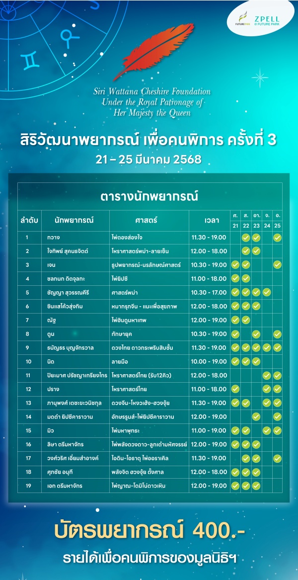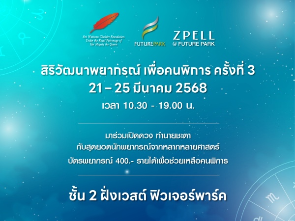 ศูนย์การค้าฟิวเจอร์พาร์ คและสเปลล์ ร่วมกับมูลนิธิสิริวัฒนาเชสเชี ยร์ ในพระบรมราชินูปถัมภ์ จัดงาน “สิริวัฒนาพยากรณ์ เพื่อคนพิการ” ครั้งที่ 3 มหกรรมรวมสุดยอดนักพยากรณ์ชื่ อดังระดับประเทศกว่า 19 ท่าน ที่พร้อมเปิดดวงชะตาให้คำปรึ กษาและไขข้อสงสัยในทุกเรื่ องของชีวิต ตั้งแต่เรื่องความรัก การงาน การเงิน ไปจนถึงสุขภาพและโชคลาภ ตั้งแต่วันที่ 21-25 มีนาคม 2568 ณ บริเวณชั้น 2 ฝั่งเวสต์ ศูนย์การค้าฟิวเจอร์พาร์ค ตั้งแต่เวลา 10.30 – 19.00 น.