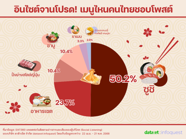 การวิเคราะห์ข้อมูลจาก Social Listening เผยพฤติกรรมคนไทยกับอาหารญี่ปุ่นที่น่าสนใจ โดย ซูชิ ขึ้นแท่นเมนูยอดฮิตด้วยยอดเอ็นเกจเมนต์สูงสุด ด้านแบรนด์ร้านอาหารญี่ปุ่นยอดนิยม Yayoi ครองอันดับหนึ่ง ตามมาด้วย Sushiro และ ZEN สำหรับพฤติกรรมการใช้จ่าย พบว่าคนไทยให้ความสนใจช่วงราคา 251-500 บาทต่อมื้อต่อคน มากที่สุด โดยผู้บริโภคเน้นความคุ้มค่าที่ตอบโจทย์ทั้งรสชาติและประสบการณ์ ขณะที่ยากินิกุและชาบูยังคงเป็นตัวเลือกสำหรับมื้อพิเศษ
