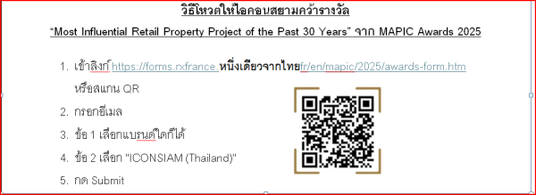หลังจากเคยเอาชนะคู่แข่งจากทั่วโลกคว้ารางวัลชนะเลิศ MAPIC Award 2019 ในสาขา Best Shopping Centre ศูนย์การค้าที่ดีที่สุดในโลก มาครองก่อนหน้านี้ ไอคอนสยาม อภิมหาโครงการเมืองแห่งการใช้ชีวิตสู่โลกอนาคต สัญลักษณ์แห่งความรุ่งโรจน์ของไทยริมฝั่งแม่น้ำเจ้าพระยา ได้สร้างประวัติศาสตร์อีกครั้งด้วยการการเข้าชิงรางวัล “Most Influential Retail Property Project of the Past 30 Years” จาก MAPIC Awards 2025 ซึ่งนับเป็นความภาคภูมิใจของคนไทยทั้งประเทศ เพราะไอคอนสยามคือตัวแทนเพียงหนึ่งเดียวของประเทศไทยที่ผ่านเข้าสู่รอบชิงชนะเลิศในเวทีโลก โดยคนไทยทุกคนสามารถมีส่วนร่วมในการเขียนประศาสตร์หน้าใหม่ให้ประเทศไทยขึ้นแท่นเป็นผู้นำค้าปลีกโลก และเป็นจุดหมายปลายทางที่ทั่วโลกต้องมาเยือนได้ ผ่านการรวมพลังโหวตให้ไอคอนสยามคว้าชัย เป็นสุดยอดโครงการค้าปลีกของโลกในรอบ 30 ปี ผ่านช่องทางดังนี้