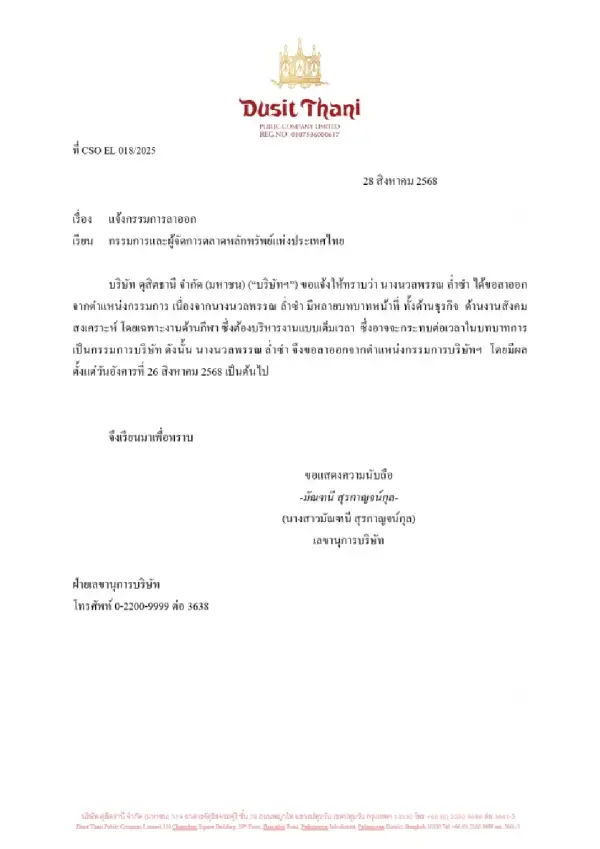บริษัทจำกัด (มหาชน) หรือ DUSIT รายงานต่อตลาดหลักทรัพย์แห่งประเทศไทย เพื่อขอแจ้งให้ทราบว่า มาดามแป้ง นางนวลพรรณ ล่ำซำ ได้ขอลาออก จากตำแหน่งกรรมการ