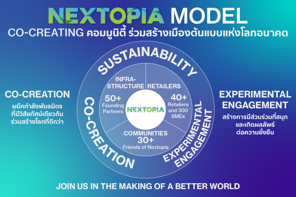 NEXTOPIA Model คือแพลตฟอร์มต้นแบบแห่งการผนึกกำลังครั้งยิ่งใหญ่ เพื่อร่วมสร้างโลกที่ดีกว่า โดยใช้แนวคิด Co-creation ร่วมกับพันธมิตรที่มีวิสัยทัศน์เดียวกัน และสร้างการมีส่วนร่วมในการนำเสนอประสบการณ์ (Experimental Engagement) ที่สนุกและสร้างผลกระทบเชิงบวกที่นำไปสู่ความยั่งยืน ประกอบด้วย 3 องค์ประกอบหลัก ได้แก่