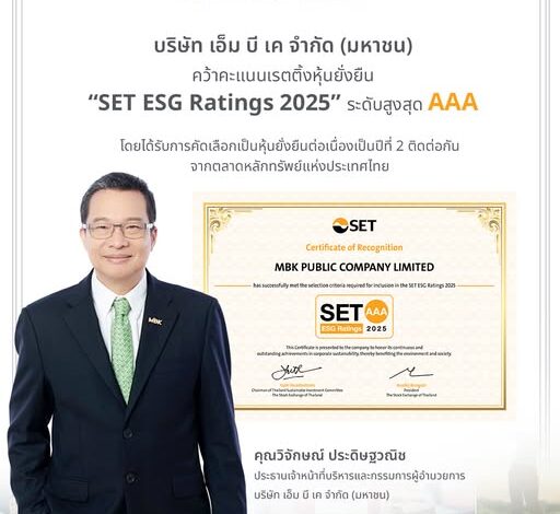 MBK คว้าคะแนนเรตติ้งหุ้นยั่งยืน SET ESG Ratings 2025 ระดับ AAA ซึ่งเป็นระดับสูงสุด โดยได้รับการคัดเลือกเป็นหุ้นยั่งยืนต่อเนื่องเป็นปีที่ 2 ติดต่อกัน