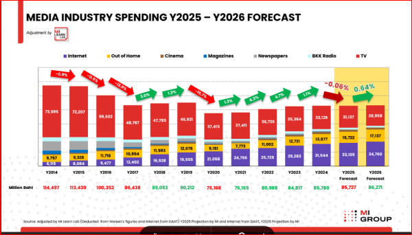นายภวัต เรืองเดชวรชัย, MI GROUP เผยคาดการณ์ตัวเลขเม็ดเงินโฆษณาในไทยในปี 2569 จะอยู่ที่ 86,271 ล้านบาททรงตัวกับปี 2568 โดยเติบโตขึ้นเพียง +0.64%จากปัจจัยบวกและลบในช่วงไตรมาสสุดท้ายของปีนี้ที่ยังมีความไม่แน่นอนและคาดเดาได้ยาก แม้ตัวเลขจะดูไม่เติบโตแต่การขยายตัวของการใช้เม็ดเงินสื่อดิจิทัลนั้นได้มีการคาดการณ์ตัวเลขเม็ดเงินที่ไม่สามารถเก็บข้อมูลได้โดยเฉพาะในส่วนงบที่ SMEs ทำการตลาดเอง รวมถึง Influencer Marketing ทำให้ตัวเลขตัวเลขเม็ดเงินโฆษณาอาจจะแตะถึง111,603 ล้านบาท