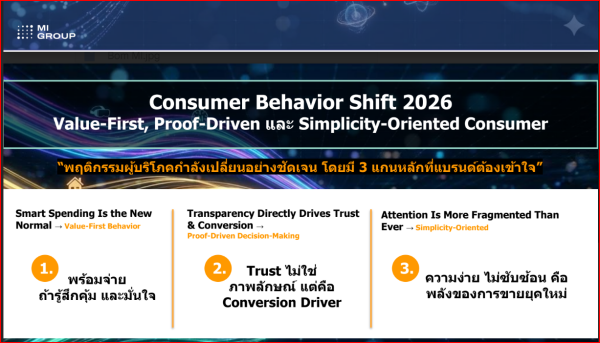 นางสาว วรินทร์ ทินประภา, Chief Growth Officer, MI GROUP สรุปทิศทางการตลาดปี 2569 ว่าแบรนด์กำลังเผชิญการเปลี่ยนแปลงพร้อมกันทั้งพฤติกรรมผู้บริโภค สื่อ และเทคโนโลยีโดยนักการตลาดจำเป็นต้องปรับกลยุทธ์ให้ “ต้องวางกลยุทธ์อย่างรอบคอบและสมดุล” มากกว่าเดิม ภายใต้ 5ประเด็นสำคัญ ได้แก่