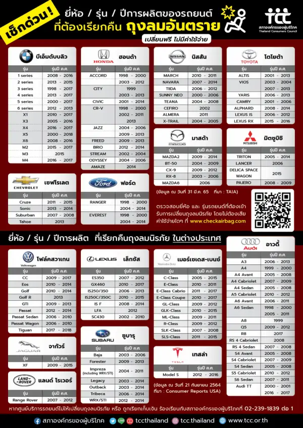กรมการขนส่งทางบก จึงขอให้ประชาชนอย่าชะล่าใจ และเร่งตรวจสอบว่ารถของท่านเข้าข่ายต้องเข้ารับการตรวจสอบและแก้ไขถุงลมนิรภัยหรือไม่ ผ่าน 4 ช่องทางดังต่อไปนี้