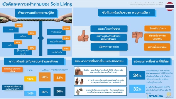 - อินไซต์ใหม่ของการอยู่คนเดียว: งานวิจัยโดย Stamina Asia และ Marketbuzzz ชี้ “คนโสดไม่ได้เหมือนกันทุกคน” โดยแบ่งออกเป็น 4 เซกเมนต์หลักตามทัศนคติและอารมณ์ ซึ่งมีเพียง 21% เท่านั้นที่เป็นกลุ่ม Fulfilled Solo หรือผู้ที่ภูมิใจและเติมเต็มกับการใช้ชีวิตอิสระอย่างแท้จริง