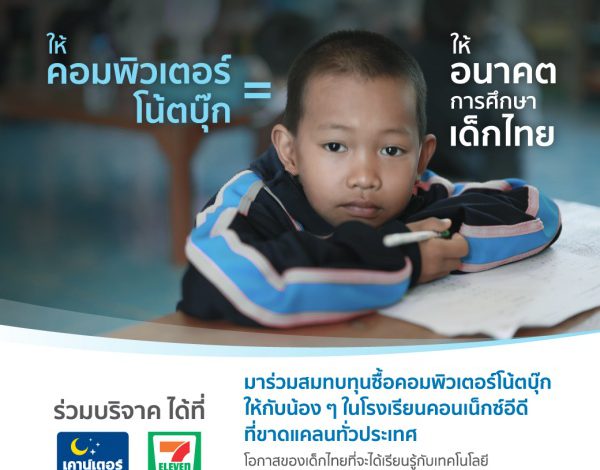 ซีพี ออลล์ ร่วมกับมูลนิธิสานอนาคตการศึกษา คอนเน็กซ์อีดี (CONNEXT ED Foundation) ขอเชิญชวนร่วมเป็นส่วนหนึ่งในการส่งมอบโอกาสให้เด็กไทยได้เรียนรู้กับเทคโนโลยีอย่างมีประสิทธิภาพในช่วงพัฒนาการที่สำคัญของชีวิต ด้วยการร่วมสมทบทุนซื้อคอมพิวเตอร์โน้ตบุ๊กให้น้องๆ ในโรงเรียนคอนเน็กซ์อีดี ที่ขาดแคลนทั่วประเทศ ตามโครงการ “คอมพิวเตอร์โน้ตบุ๊กเพื่อการศึกษา” (NOREBOOK FOR EDUCATION) โดยสามารถร่วมบริจาคผ่านช่องทางเคาน์เตอร์เซอร์วิส ในร้าน 7-Eleven ทุกสาขา ตั้งแต่วันที่ 15 ธันวาคม 2565 เป็นต้นไป