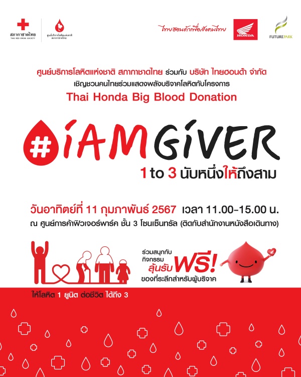 มาร่วมแสดงพลังบริจาคโลหิต กับกิจกรรม Thai Honda Big Blood Donation #IAMGIVER 1 to 3 นับหนึ่งให้ถึงสาม ในวันอาทิตย์ที่ 11 กุมภาพันธ์ 2567 เวลา 11.00-15.00 น. ณ ชั้น 3 โซนเซ็นทรัล (ติดกับสำนักงานหนังสือเดินทาง) ศูนย์การค้าฟิวเจอร์พาร์ค