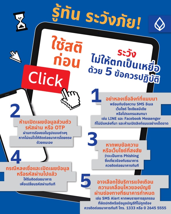 - กรณีหลงเชื่อและเปิดเผยข้อมูลหรือรหัสผ่านไปแล้ว ให้รีบติดต่อธนาคารเพื่อเปลี่ยนรหัสผ่านทันที