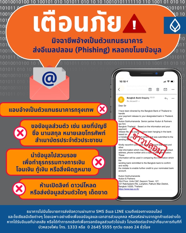 ธนาคารกรุงเทพ เตือนลูกค้าระวังมิจฉาชีพสวมรอยลวงขอข้อมูลผ่าน SMS-อีเมล-โซเชียลแนะนำ 5 ข้อควรปฏิบัติเพื่อทำธุรกรรมอย่างปลอดภัย