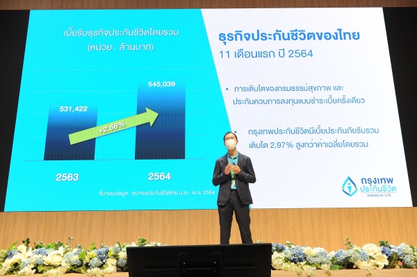 นายโชน โสภณพนิช กรรมการผู้จัดการใหญ่และประธานเจ้าหน้าที่บริหาร บริษัท กรุงเทพประกันชีวิต จำกัด (มหาชน) หรือ BLA เปิดเผยว่า ในปี 2564 แม้ธุรกิจประกันชีวิตโดยรวมจะได้รับผลกระทบจากภาวะเศรษฐกิจที่ซบเซา กำลังซื้อผู้บริโภคลดลง จากการระบาดของเชื้อไวรัสโคโรน่า 2019 (โควิด-19) แต่โดยภาพรวมช่วง 11 เดือนแรกของปี 2564 เบี้ยประกันชีวิตรับรวมทั้งระบบอยู่ที่ 545,039 ล้านบาท เติบโต 2.56% เมื่อเทียบจากช่วงเดียวกันปีก่อน (ที่มา : สมาคมประกันชีวิตไทย) โดยเป็นการเติบโตของกรมธรรม์ประกันสุขภาพ (Health Insurance) และประกันชีวิตควบการลงทุน(Unit-Linked) แบบชำระเบี้ยครั้งเดียว(Single premium) สำหรับผลการดำเนินงานของกรุงเทพประกันชีวิต สามารถเติบโตได้สูงกว่าค่าเฉลี่ยโดยรวม