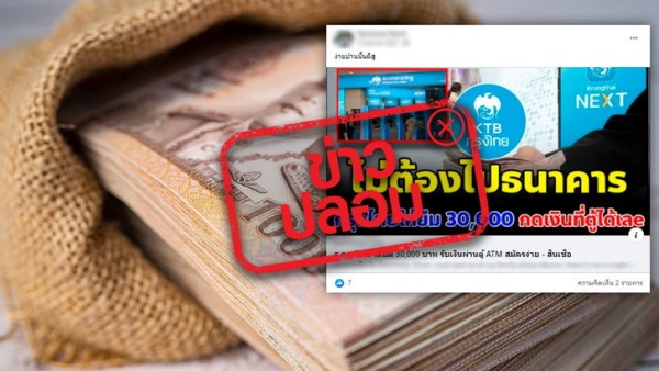 ตามที่มีการเผยแพร่ข้อมูลเกี่ยวกับประเด็นเรื่องธนาคารกรุงไทยให้ยืม 30,000 บาท สมัครง่าย รับเงินผ่านตู้ ATM ทางศูนย์ต่อต้านข่าวปลอมได้ดำเนินการตรวจสอบข้อเท็จจริงโดยธนาคารกรุงไทย พบว่าประเด็นดังกล่าวนั้น เป็นข้อมูลเท็จ