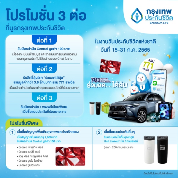 • ต่อที่ 3 : รับบัตรกำนัล / ของพรีเมียมพิเศษ เมื่อซื้อแบบประกันที่ร่วมรายการเฉพาะในงานเท่านั้น
