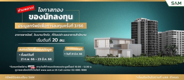SAM บริษัทบริหารสินทรัพย์ของคนไทย เพิ่มโอกาสทองให้นักลงทุนและผู้ที่ต้องการมีที่อยู่อาศัยเป็นของตัวเอง จัดประมูลทรัพย์ NPA ส่งท้ายไตรมาสแรก ทั้งทรัพย์เพื่ออยู่อาศัยและทรัพย์เพื่อการลงทุน 146 รายการ มูลค่ารวมกว่า 628 ล้านบาท พร้อมปรับลดราคาพิเศษสุดคุ้มทุกความต้องการ เปิดซอง 31 มี.ค.นี้