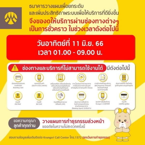 โปรดวางแผนการทำธุรกรรมล่วงหน้า และขออภัยในความไม่สะดวก โดยสามารถสอบถามข้อมูลเพิ่มเติมติดต่อ Krungsri Call Center โทร. 1572
