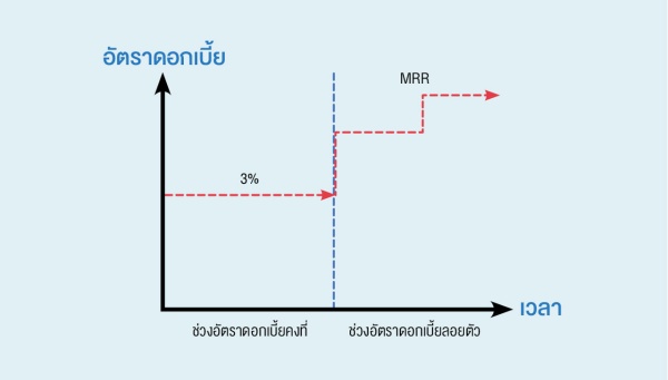 2. กลุ่มที่ได้อัตราดอกเบี้ยเงินกู้แบบลอยตัว (Floating Rate) กลุ่มนี้จะได้รับผลกระทบเมื่ออัตราดอกเบี้ยในสัญญาถึงกำหนดปรับเป็น Floating Rate เนื่องจากค่างวดที่ชำระในแต่ละเดือนจะมีภาระดอกเบี้ยเพิ่มมากขึ้น หากจ่ายค่างวดบ้านเป็นจำนวนเงินเท่ากันทุกเดือน เมื่ออัตราดอกเบี้ยสูงขึ้นก็จะเหลือเงินมาตัดชำระเงินต้นได้น้อยลง