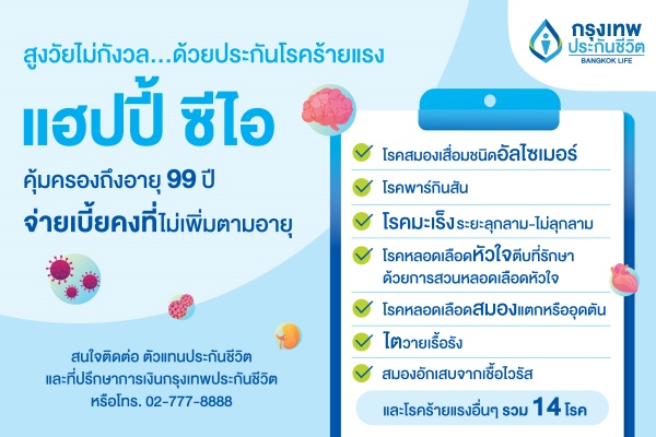 กรุงเทพประกันชีวิต ร่วมรณรงค์เนื่องในวันอัลไซเมอร์โลก 21 กันยายน ของทุกปี ชวนคนไทยตระหนักถึงการใส่ใจสุขภาพ พร้อมวางแผนการดูแลและเตรียมรับมือเพื่อเข้าถึงการรักษาที่เหมาะสม ผ่านแบบประกัน แฮปปี้ ซีไอ ที่ช่วยสร้างความอุ่นใจด้วยผลประโยชน์ที่คุ้มค่า ให้ความคุ้มครองโรคร้ายแรงรวมถึงโรคสมองเสื่อมชนิดอัลไซเมอร์ที่พบเพิ่มมากขึ้นในผู้สูงอายุ รับเงินก้อน 100% ของจำนวนเงินเอาประกันภัย หรือเบี้ยประกันภัยที่ชำระแล้วสะสมตามจริงแล้วแต่จำนวนใดจะมากกว่า ไม่ว่าจะเป็นโรคร้ายแรงระหว่างสัญญา หรือมีชีวิตอยู่จนครบกำหนดสัญญา พร้อมอุ่นใจกับความคุ้มครองยาวนานถึงอายุ 99 ปี ด้วยเบี้ยประกันภัยคงที่ตลอดสัญญา