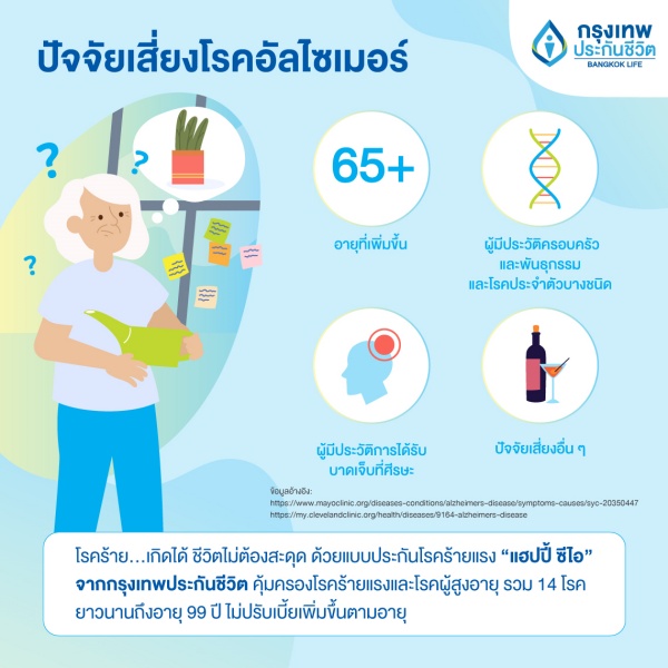 ทั้งนี้ เนื่องในวันอัลไซเมอร์โลก วันที่ 21 กันยายนนี้ กรุงเทพประกันชีวิตขอร่วมรณรงค์ให้ทุกคนตระหนักถึงความสำคัญและทำความเข้าใจของโรคดังกล่าว รวมทั้งเตรียมแผนการรับมือทั้งด้านสุขภาพและการวางแผนด้านการเงิน เพื่อช่วยให้ผู้ป่วยและคนใกล้ชิดมีคุณภาพชีวิตที่ดีในระยะยาว โดยปัจจุบัน บริษัทฯ ได้พัฒนาแบบประกัน “แฮปปี้ ซีไอ” ซึ่งเป็นสัญญาเพิ่มเติมที่ให้ความคุ้มครองโรคร้ายแรงที่มักพบบ่อย 6 กลุ่ม ซึ่งนอกจากจะให้ความคุ้มครองกลุ่มโรคที่มักเกิดขึ้นกับผู้สูงอายุอย่างโรคสมองเสื่อมชนิดอัลไซเมอร์และโรคพาร์กินสันแล้ว ยังรวมไปถึงกลุ่มโรคมะเร็งและเนื้องอก กลุ่มโรคที่เกียวกับหัวใจและหลอดเลือด กลุ่มโรคที่เกียวกับเส้นเลือดสมองและระบบประสาท กลุ่มโรคที่เกียวกับไต กลุ่มโรคที่เกียวกับการติดเชื้ออย่างรุนแรง