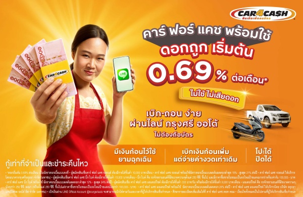 มองหาเงินก้อนอนุมัติไว เลือก ‘คาร์ ฟอร์ แคช พร้อมใช้’ ตัวช่วยทุกเรื่องฉุกเฉิน กับดอกเบี้ยสุดคุ้มเพียง 0.69% ต่อเดือน!
