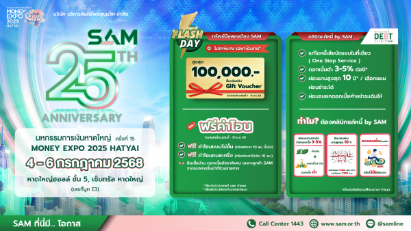 SAM ฉลองครบ 25 ปี ส่งมอบโอกาสเพื่อชาวใต้ งาน “มันนี่ เอ็กซ์โป หาดใหญ่” ขนทรัพย์มือสองกว่า 4,000 รายการ เข้าร่วม จัดโปรเด็ด “ฟรี! ค่าโอน” แจก Gift Voucher มูลค่าสูงสุด 1 แสนบาท พร้อมแคมเปญดอกเบี้ยพิเศษจากแบงก์พันธมิตร และโครงการ “คลินิกแก้หนี้ by SAM” ช่วยแก้หนี้เสียสารพัดบัตร