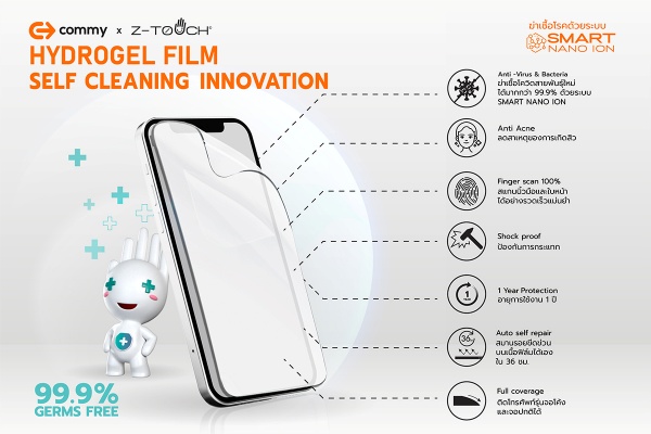 คอมมี่ เอ็ก ซีทัช ไฮโดรเจล (Commy x Z-TOUCH Hydrogel) ฟิล์มไฮโดรเจลสำหรับมือถือ ฆ่าเชื้อไวรัส แบคทีเรีย และเชื้อโควิดสายพันธุ์ใหม่ได้มากถึง 99.9% และช่วยลดสาเหตุของการก่อให้เกิดสิวได้ โดยการร่วมมือกับซีทัชในการพัฒนาฟิล์มไฮโดรเจลแบบใหม่นั้น นับเป็นการผสานจุดเด่นของทั้งสององค์กรทั้งผู้นำนวัตกรรมในการฆ่าเชื้ออย่าง ซีทัช และ คอมมี่ ซึ่งมีความเชี่ยวชาญด้านการผลิตและจัดจำหน่ายอุปกรณ์และสินค้าไอทีชั้นนำของประเทศ ทำให้เกิดนวัตกรรมและสร้างสินค้าใหม่ที่ตอบสนองต่อความปลอดภัยปลอดเชื้อแก่อุปกรณ์มือถือในยุคโควิด-19 และผสานคุณสมบัติเด่นของฟิล์มไฮโดรเจล ที่มีความยืดหยุ่นสูง สมานรอยขีดข่วนได้เองใน 36 ชม. ภายใต้แนวคิด “ปลอดภัยทุกการทัช ป้องกันทุกแรงกระแทก” ให้มือถือคุณ