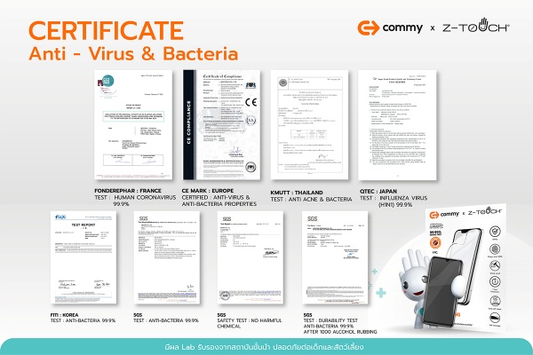 ผลความร่วมมือกับ คอมมี่ ในครั้งนี้ ทำให้เกิดผลิตภัณฑ์ใหม่ คอมมี่ เอ็ก ซีทัช ไฮโดรเจล (Commy x Z-TOUCH Hydrogel) ฟิล์มไฮโดรเจลสำหรับโทรศัพท์มือถือ ที่มีคุณสมบัติเด่นในการฆ่าเชื้อไวรัส เชื้อโควิดสายพันธุ์ใหม่ รวมถึงเชื้อแบคทีเรียซึ่งเป็นสาเหตุที่ก่อให้เกิดสิว โดยใช้เทคโนโลยีสมาร์ทนาโนไอออน ซึ่งประจุไอออนของโลหะจะเข้าไปทำลายผนังเซลล์ของไวรัสและแบคทีเรีย ทำให้ฆ่าเชื้อไวรัส เชื้อแบคทีเรีย และเชื้อโควิดสายพันธุ์ใหม่ ได้มากถึง 99.9% ภายในเวลา 30 นาที และยังมีอายุการใช้งานนานถึง 1 ปี ซึ่งผลทดสอบประสิทธิภาพหลังเช็ดด้วยแอลกอฮอล์ 1,000 ครั้ง พบว่ายังคงประสิทธิภาพการฆ่าเชื้อได้ 99.9% นอกจากนั้นยังได้รับการรับรองผลการฆ่าเชื้อจากหลายสถาบันชั้นนำทั้งในและต่างประเทศ อาทิเช่น Q-TEC จากประเทศญี่ปุ่น, FONDEREPHAR จากประเทศฝรั่งเศส, CE MARK จากยุโรป, SGS สถาบันชั้นนำระดับนานาชาติ และ KMUTT มหาวิทยาลัยเทคโนโลยีพระจอมเกล้าธนบุรี เป็นต้น ถือเป็นเรื่องน่ายินดีอย่างยิ่งที่การร่วมมือกันทำให้คนไทยได้ใช้เทคโนโลยีใหม่ในราคาที่จับต้องได้ และช่วยเพิ่มความมั่นใจในความปลอดภัยจากการติดเชื้อจากการใช้งานโทรศัพท์มือถือในยุคโควิด-19 นี้อีกด้วย