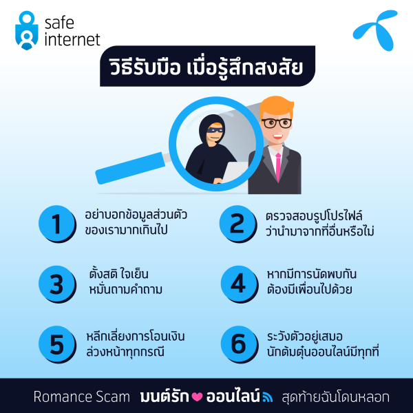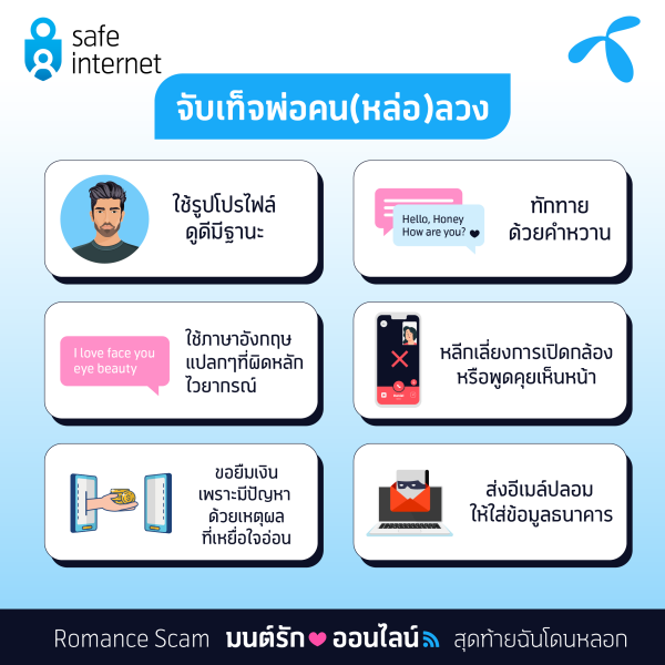 dtac Safe Internet ชวนทำความรู้จักภัยกลโกงไซเบอร์ที่อาจแฝงมาในวันวาเลนไทน์ ‘Romance Scam’ หรือการ ‘หลอกให้รัก หวังแสวงหาผลประโยชน์จากความเชื่อใจของเหยื่อ’ โดยหลอกให้โอนเงินหรือทรัพย์สินไปให้ ปัจจุบันมีผู้เสียหายจากการหลอกโอนเงินมากมาย และหนึ่งในกลโกงออนไลน์ที่มี มีผู้เสียหายตกเป็นเหยื่อมากที่สุดคือ Romance Scam สำหรับประเทศไทยนั้น ข้อมูลจากสำนักงานป้องกันและปราบปรามการฟอกเงิน ได้ระบุว่า ในช่วงหนึ่งปีที่ผ่านมานับตั้งแต่เดือนมิถุนายน พ.ศ. 2561 จนถึง 31 พฤษภาคม พ.ศ. 2562 สถิติการรับเรื่องคดีที่เป็น Romance Scam มีผู้เสียหายหลงเชื่อและโอนเงินจำนวน 332 ราย รวมมูลค่าความเสียหายประมาณ 193,015,902.11 บาท