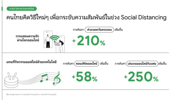 การปรับตัวของคนไทยที่หันมาใช้ออนไลน์ ทำให้คนไทยรักษาความสัมพันธ์กับคนใกล้ตัวได้ แม้จะต้องอยู่ในสถานการณ์กักตัว หรือไม่สามารถเดินทางได้ โดยค้นหาคำอวยพรเพิ่มขึ้น 210% กิจกรรมออนไลน์ในลักษณะของ Virtual เพิ่มสูงขึ้นอย่างคอนเสิร์ตออนไลน์ 58% และเล่นเกมออนไลน์กับแฟนเพิ่มขึ้นกว่า 250% แสดงให้เห็นถึงรูปแบบการกระชับความสัมพันธ์กับคู่ชีวิตมากขึ้น