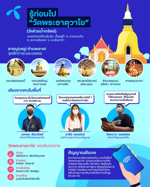 ดีแทคได้เร่งขยายเครือข่ายต่อเนื่อง รองรับพฤติกรรมการใช้งานทุกพื้นที่ทั่วไทย รวมถึงพื้นที่วัดพระธาตุวาโยโดยยังมุ่งเน้นขยายคลื่นความถี่ต่ำ โดยไตรมาสที่ผ่านมามีการติดตั้งสถานีฐานบนคลื่นความถี่ต่ำเพิ่มขึ้นมากกว่า 2,800 สถานีฐาน ล่าสุดสถานีฐานบนเครือข่าย 700 MHz ได้รับการติดตั้งแล้วจํานวนทั้งสิ้นประมาณ 15,600 สถานีฐาน (ข้อมูลในไตรมาส 1/2565) โดยพัฒนาอย่างต่อเนื่องในการปรับปรุงประสบการณ์สําหรับลูกค้าทั้ง 4G และ 5G