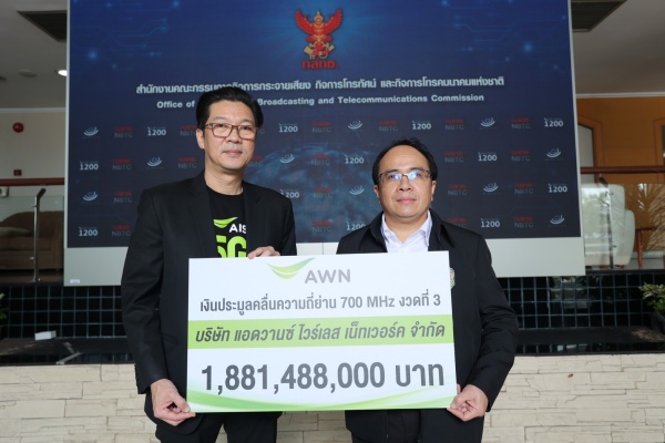 นายวรุณเทพ วัชราภรณ์ หัวหน้าฝ่ายงานธุรกิจสัมพันธ์ บริษัท แอดวานซ์ อินโฟร์ เซอร์วิส จำกัด (มหาชน) หรือ เอไอเอส ในฐานะผู้บริหาร บริษัท แอดวานซ์ ไวร์เลส เน็ทเวอร์ค จำกัด (เอดับบลิวเอ็น) เป็นตัวแทนชำระค่าคลื่นความถี่ย่าน 700 MHz งวดที่ 3 จำนวน 1,881,488,000.00 บาท (หนึ่งพันแปดร้อยแปดสิบเอ็ดล้านสี่แสนแปดหมื่นแปดพันบาทถ้วน ) รวมภาษีมูลค่าเพิ่มแล้ว โดยมี นายสุทธิศักดิ์ ตันตะโยธิน รองเลขาธิการคณะกรรมการกิจการกระจายเสียง กิจการโทรทัศน์ และกิจการโทรคมนาคมแห่งชาติ เป็นผู้รับมอบเพื่อนำส่งเงินเป็นรายได้ของแผ่นดินต่อไป