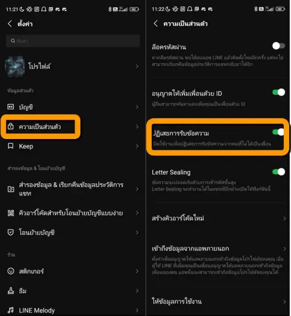 เลือก ความเป็นส่วนตัว จากนั้นแตะเปิดที่ ปฎิเสธการรับข้อความ