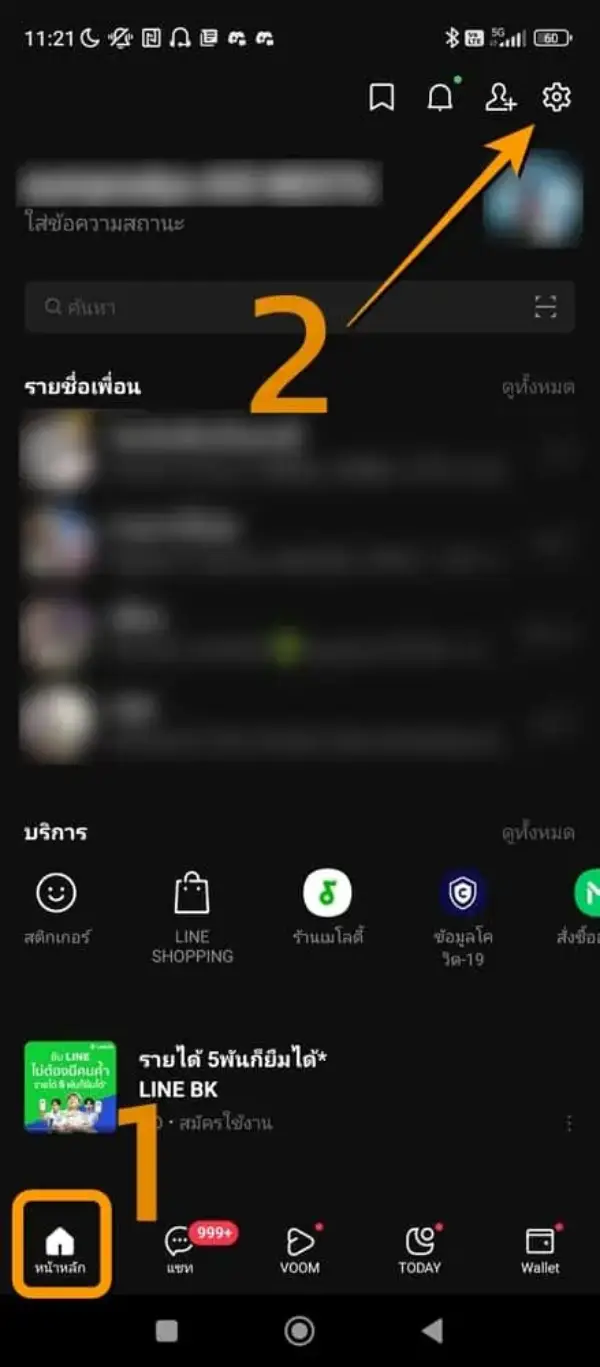 เปิดแอป LINE แตะที่หน้าหลัก แล้วเลือกไอคอนตั้งค่า