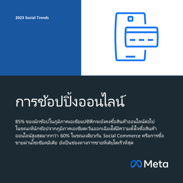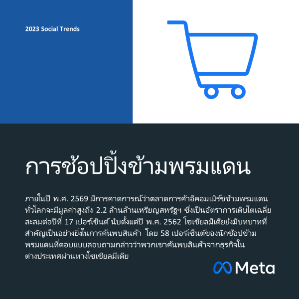 อีคอมเมิร์ซข้ามพรมแดนทั่วโลกจะมีมูลค่าสูงถึง 2.2 ล้านล้านเหรียญสหรัฐฯ ซึ่งเป็นอัตราการเติบโตเฉลี่ยสะสมต่อปีที่ 17 เปอร์เซ็นต์ นับตั้งแต่ปี พ.ศ. 2562 ทั้งนี้ Meta ได้ร่วมมือกับ YouGov ในการสำรวจความคิดเห็นนักช้อปจำนวนกว่า 16,000 คนจาก 8 ประเทศ โดยมีผู้ตอบแบบสอบถามจำนวนกว่าครึ่งกล่าวว่าพวกเขาเคยซื้อสินค้าจากธุรกิจในต่างประเทศ และ 82 เปอร์เซ็นต์กล่าวว่าพวกเขามีโอกาสที่จะซื้อสินค้าจากธุรกิจในต่างประเทศ ซึ่งตอกย้ำให้เห็นถึงโอกาสในการซื้อขายข้ามพรมแดนในอนาคต นอกจากนี้ โซเชียลมีเดียยังมีบทบาทที่สำคัญเป็นอย่างยิ่งในการค้นพบสินค้า โดย 58 เปอร์เซ็นต์ของนักช้อปข้ามพรมแดนที่ตอบแบบสอบถามกล่าวว่าพวกเขาค้นพบสินค้าจากธุรกิจในต่างประเทศผ่านทางโซเชียลมีเดีย