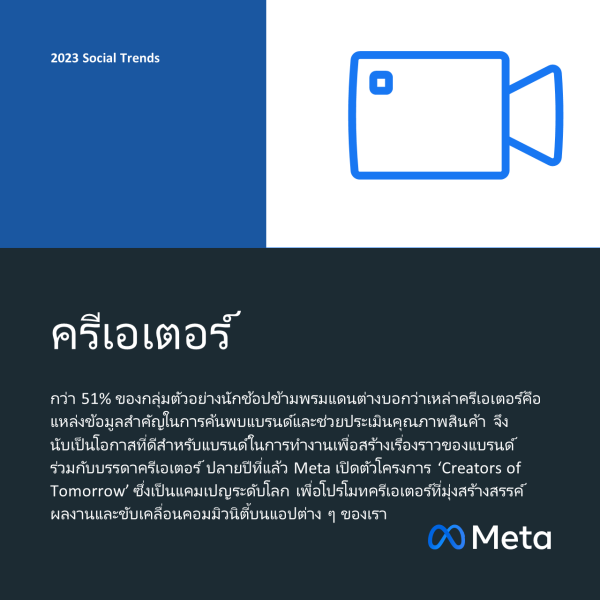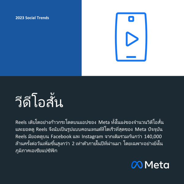 7.วิดีโอสั้น (Short-form video): วิดีโอยังคงเติบโตอย่างไม่หยุดยั้งทั่วโลกอินเทอร์เน็ต รวมไปถึงแพลตฟอร์มของเราด้วย โดยฟีเจอร์ Reels เติบโตอย่างก้าวกระโดดบนแอปของ Meta ทั้งในแง่ของจำนวนวิดีโอสั้นและยอดดู Reels จึงนับเป็นรูปแบบคอนเทนต์ที่โตเร็วที่สุดของ Meta โดยเราพบว่าผู้ใช้งาน Instagram ใช้เวลาไปกับวิดีโอ Reels ถึง 20 เปอร์เซ็นต์ ปัจจุบัน Reels มียอดดูบน Facebook และ Instagram จากเดิมที่มีรวมกันกว่า 140,000 ล้านครั้งต่อวันเพิ่มขึ้นกว่า 2 เท่าตัวในช่วงปีที่ผ่านมา โดยเฉพาะอย่างยิ่งในภูมิภาคเอเชียแปซิฟิก วิดีโอได้กลายมาเป็นวิธีหลักที่ผู้คนใช้แสดงออกถึงความเป็นตัวของตัวเองบนแพลตฟอร์มของเรา