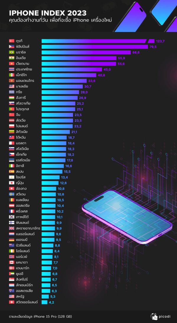 วางจำหน่ายอย่างเป็นทางการเรียบร้อยสำหรับ iPhone 15 ล่าสุด พิโคดี ประเทศไทย เปิดเผยการจัดทำดัชนีไอโฟน 2023 หรือ iPhone Index 2023 เพื่อสะท้อนเกี่ยวกับจำนวนวันทำงานของประชาชนในประเทศสำคัญ 47 ประเทศทั่วโลกที่สามารถเป็นเจ้าของไอโฟนรุ่นใหม่ในแต่ละปีได้ พบว่า สำหรับประเทศไทยนั้น คนไทยโดยเฉลี่ยต้องทำงานใช้เวลาถึง 45 หรือ 1 เดือนครึ่งพอดีที่สามารถซื้อไอโฟนรุ่นใหม่ล่าสุด ไอโฟน 15 โปร ได้ 1 เครื่อง อย่างไรก็ตาม มีเงื่อนไขว่าเงินหรือรายได้ที่คนไทยได้รับมาทั้งหมดนั้น จะถูกเก็บไว้เพื่อซื้อสมาร์ทโฟนเท่านั้น