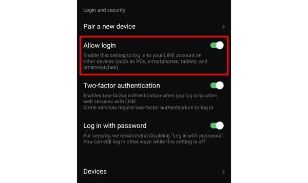 หากยังสามารถใช้งานบัญชีไลน์ได้อยู่ ให้รีบเข้าไปที่ Settings (การตั้งค่า) > Account (บัญชี) แล้วเลื่อนลงมา ถ้าหากหัวข้อ Allow login (อนุญาตให้เข้าสู่ระบบ) มีการเปิดไว้ ให้ปิดทันที เพื่อไม่ให้สามารถล็อกอินบัญชีนี้บนอุปกรณ์อื่น ๆ ได้อีก