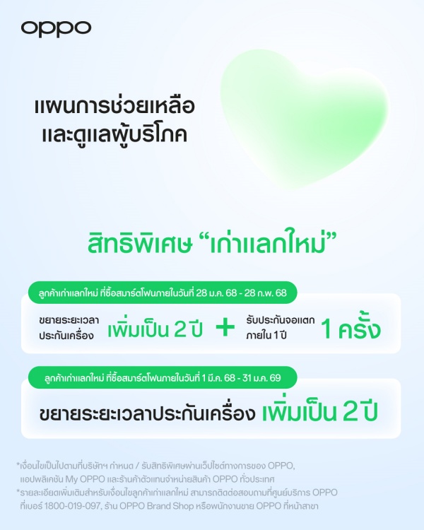 เพื่อสร้างความเชื่อมั่นให้แก่ผู้บริโภคว่าจะได้รับการดูแลจากบริษัทฯ เป็นอย่างดีที่สุด โดยผู้บริโภคที่ซื้อโทรศัพท์มือถือ OPPO ระหว่างวันที่ 1 มกราคม 2566 ถึง วันที่ 27 มกราคม 2568 (วันนี้) บริษัทฯ จะทำการขยายระยะเวลาการรับประกันเครื่องให้กับผู้บริโภค โดยมีรายละเอียดดังนี้