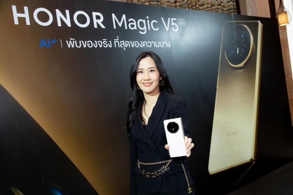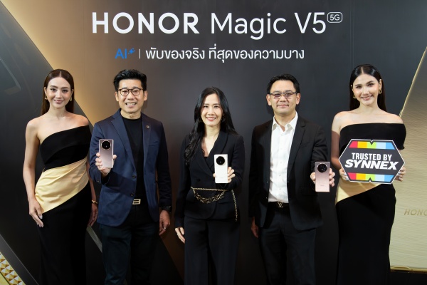 บริษัท ซินเน็ค (ประเทศไทย) จำกัด (มหาชน) หรือ SYNNEX ผู้นำด้านการจัดจำหน่ายสินค้าไอทีและเทคโนโลยีครบวงจร นำโดยนางสาวสุธิดา มงคลสุธี ประธานเจ้าหน้าที่บริหาร พร้อมทีมผู้บริหารได้ร่วมงานเปิดตัว HONOR Magic V5 สมาร์ตโฟนจอพับรุ่นล่าสุดที่บางที่สุดในโลก ภายใต้สโลแกน “พับของจริง ที่สุดของความบาง – Slimmest with No Compromise” ด้วยดีไซน์หรูหราล้ำสมัย และบางเพียง 8.8 มิลลิเมตร เมื่อพับหน้าจอ พร้อมมาตรฐานกันน้ำและฝุ่นที่รองรับการใช้งานได้ทุกสถานการณ์ เสริมด้วยแบตเตอรี่ HONOR Silicon-Carbon รุ่นใหม่ ที่ความจุสูงถึง 5,820 mAh ผสาน Advance AI ทรงพลัง และฟังก์ชันการทำงานอัจฉริยะครบครัน เพื่อมอบประสบการณ์การใช้งานยุคใหม่อย่างไร้ขีดจำกัด โดย HONOR Magic V5 เปิดตัวพร้อม 3 สีพรีเมียม ได้แก่ Dawn Gold, Reddish Brown และ Ivory White วางจำหน่ายอย่างเป็นทางการในประเทศไทยในวันที่ 30 สิงหาคม 2568 เป็นต้นไป ในราคา 57,990 บาท พร้อมข้อเสนอสุดพิเศษมากมาย