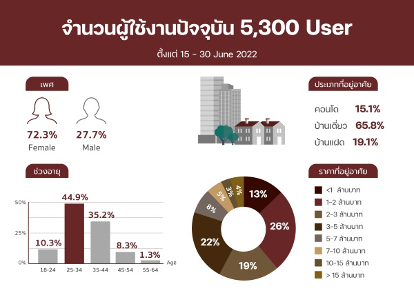 นับตั้งแต่เปิดงาน Home-Loan-NPA Grand Sale 2022 ในรูปแบบ 3D Virtual Exhibition จนถึงวันที่ 30 มิถุนายน 2565 มีผู้เข้าชมงานผ่าน Online แล้วจำนวน 5,300 ราย เป็นผู้หญิงถึง 72.3% และผู้ชาย 27.7% โดยพบว่า ช่วงอายุของผู้เข้าชมงาน Online ส่วนใหญ่หรือ 44.9% มีอายุระหว่าง 25-34 ปี และอีก 35.2% มีช่วงอายุระหว่าง 35-44 ปี ซึ่งทั้ง 2 ช่วงอายุเป็นช่วงที่ต้องการหาซื้อที่อยู่อาศัย เพื่อเริ่มสร้างและขยับขยายครอบครัว โดยมีสัดส่วนรวมกันสูงถึง 80%