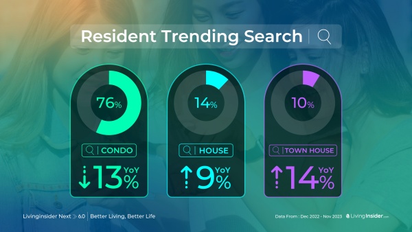 จากสถิติการค้นหา คอนโด กับ บ้าน ในช่วงระหว่างปี 2022 – 2023 หากเป็นการเปรียบเทียบว่าผู้ค้นหาส่วนใหญ่สนใจบ้านหรือคอนโด ก็ต้องบอกเลยว่าในปีนี้คนส่วนใหญ่ยังค้นหาคอนโดเป็นหลัก ด้วยสัดส่วน การค้นหาระหว่างบ้าน คอนโด และทาวน์โฮม จะเป็นประมาณ 76 : 14 : 10