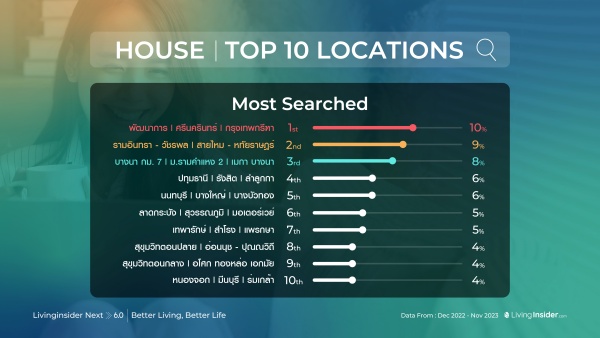 ด้านทำเลยอดฮิตสำหรับบ้านในปีที่ผ่าน อันดับ 1 ตกเป็นของทำเลพัฒนาการ ศรีนครินทร์ ซึ่งแซงทำเลแชมป์เก่าในปีที่แล้วอย่าง รามอินทรา – วัชรพล ส่วนอันดับ 3 คือ บางนา บางพลี รามคำแหง โดยเฉพาะโซนเมกาบางนา ถือว่าเป็นทำเลยอดนิยมเลยทีเดียว อันดับ 4 เป็นของปทุมธานี รังสิต และอันดับ 5 ได้แก่ นนทบุรี บางใหญ่ บางบัวทอง